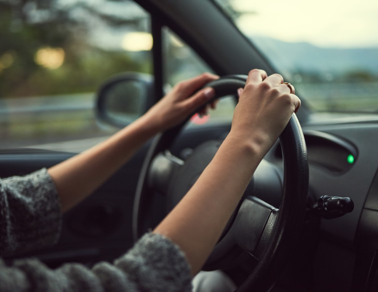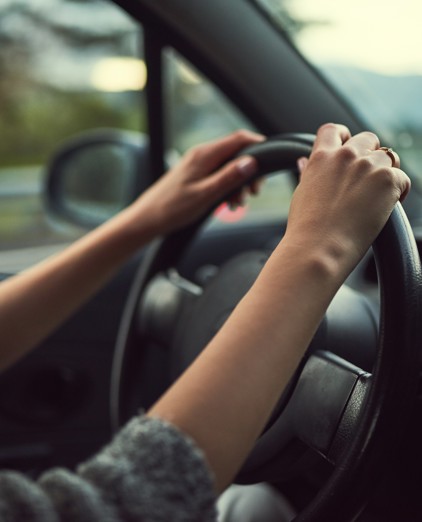 A white outline of a car with a large thumbs-up symbol above it, set on a dark blue circular background.